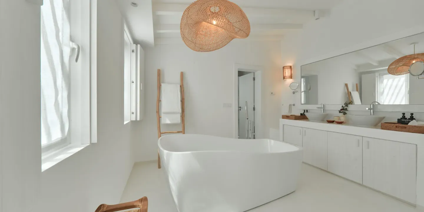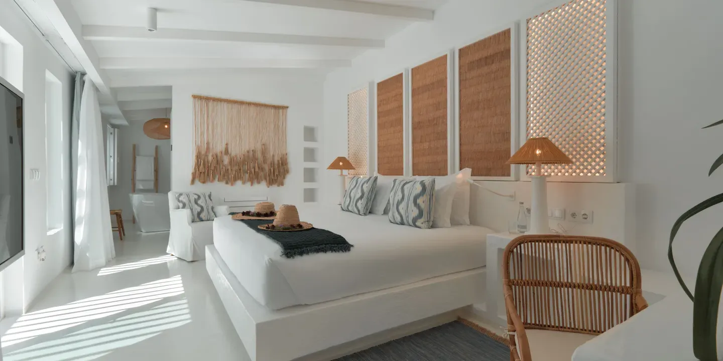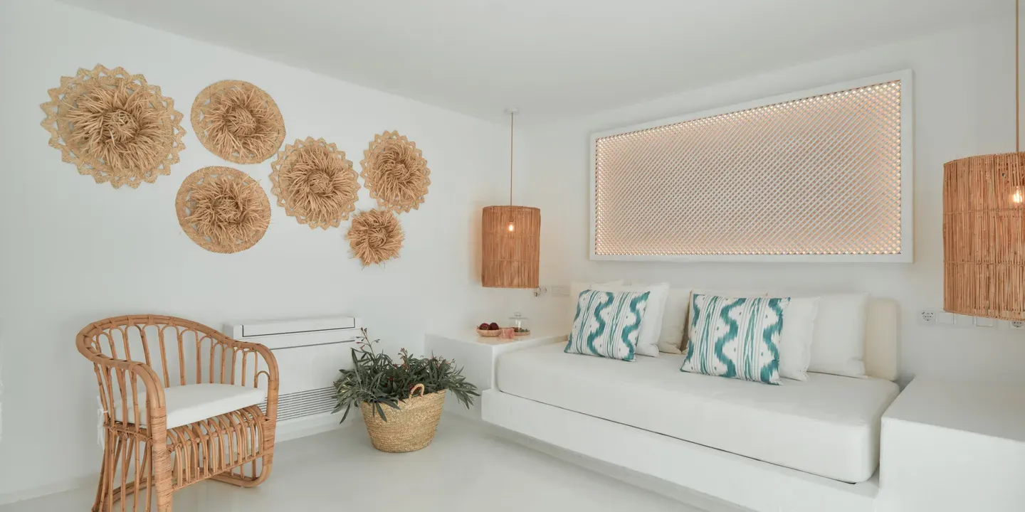 O interior, tal como o exterior, é marcado pelo branco que vai sendo cortado, aqui e ali, por apontamentos de design que remetem para o artesanato local – em madeira, cestaria, corda. Um espaço depurado onde a simplicidade se torna um luxo.